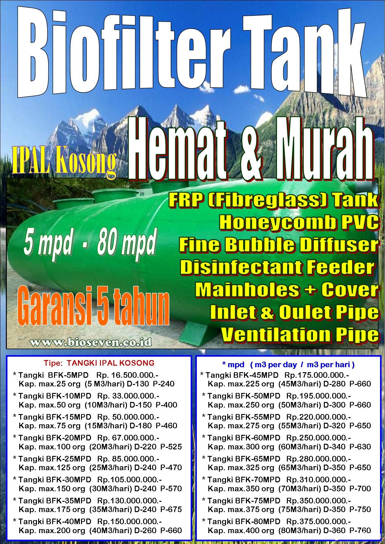 Tangki IPAL Kosong (Biofilter tank), adalah unit pengolahan limbah domestik / komunal yang sangat sederhana & murah harganya. Bekerja dengan menerapkan prinsip dasar pengolahan limbah sistem anaerob, tetapi dapat dikembangkan (Up grade) menjadi semi aerob dan bahkan full aerob, sesuai dengan kebutuhan, dilengkapi dengan filter serta media yang berfungsi untuk memproses limbah domestic menjadi layak buang, ramah lingkungan dan telah banyak digunakan oleh proyek-proyek diseluruh Indonesia. Khususnya untuk Limbah Komersial (Mall, Pertokoan, Perkantoran, Pergudangan, dll), Hospitality (Hotel, Apartemen, Rusunawa, Rumah sakit, Sekolahan, Indekost, dll)